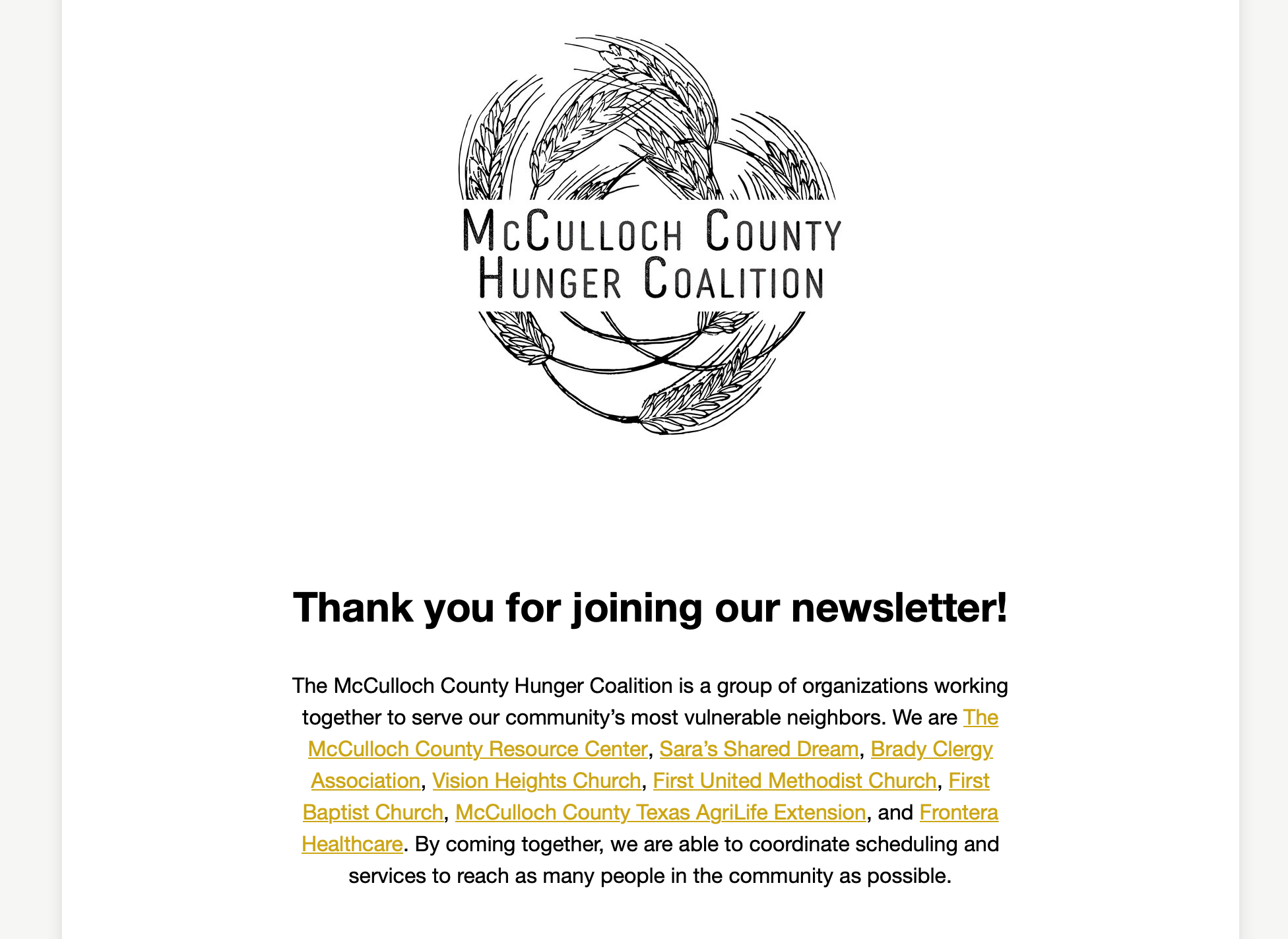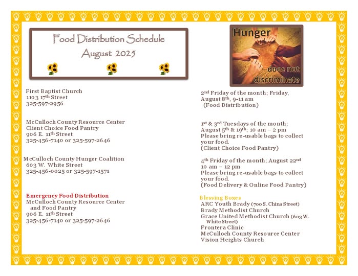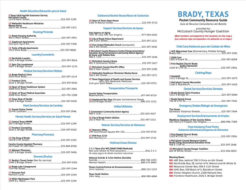The McCulloch County Hunger Coalition is a group of organizations working together to end hunger and poverty in our community. We are comprised of The McCulloch County Resource Center, Brady Clergy Association; Vision Heights Church, Grace United Methodist Church, Brady Methodist Church & Wesley Nurse, First Baptist Church, Redeemer Church, McCulloch County Texas AgriLife Extension, Brady ISD, The McCulloch County Senior Center and Frontera Healthcare.